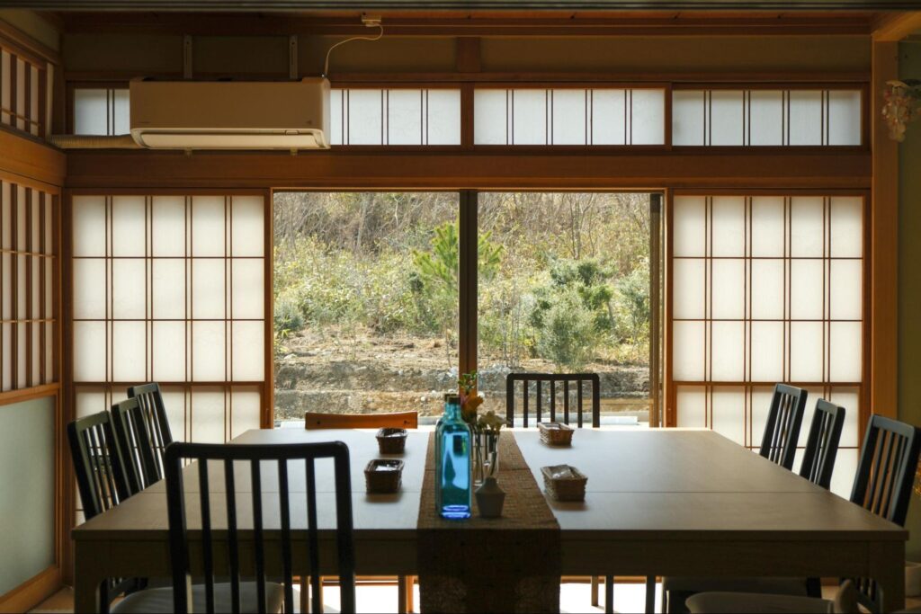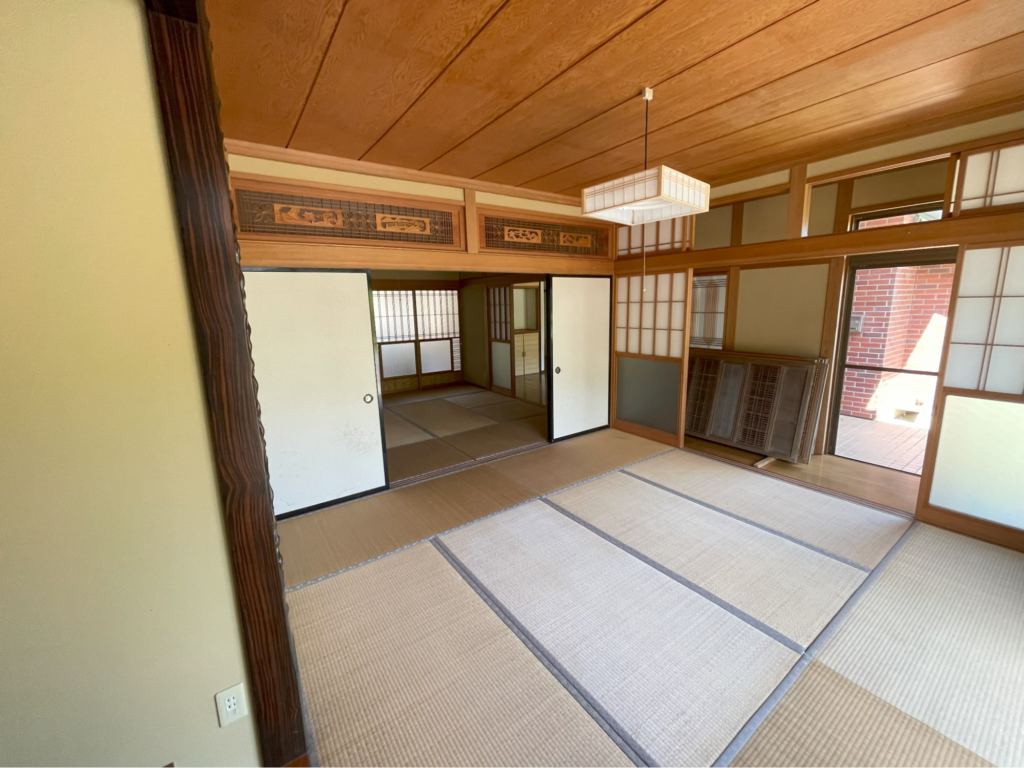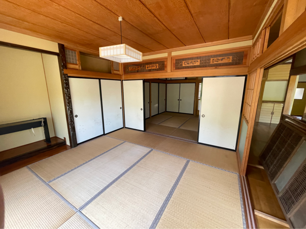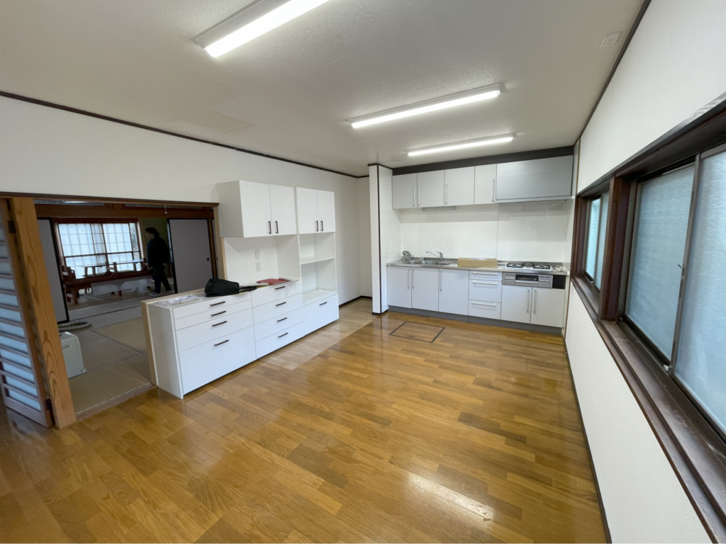 内見したのは11月。紅葉が終わった山々を背に、夕陽を浴びて佇む平屋は落ち着きのある静かな雰囲気をまとっていて、見た瞬間に「ここに住む!」と確信しました。中に入ると、この二間続きの和室があって、子どもたちを集めたり、小さなお店をしたりするのにもピッタリだと思いました。キッチンが広いのも決め手の一つですね。