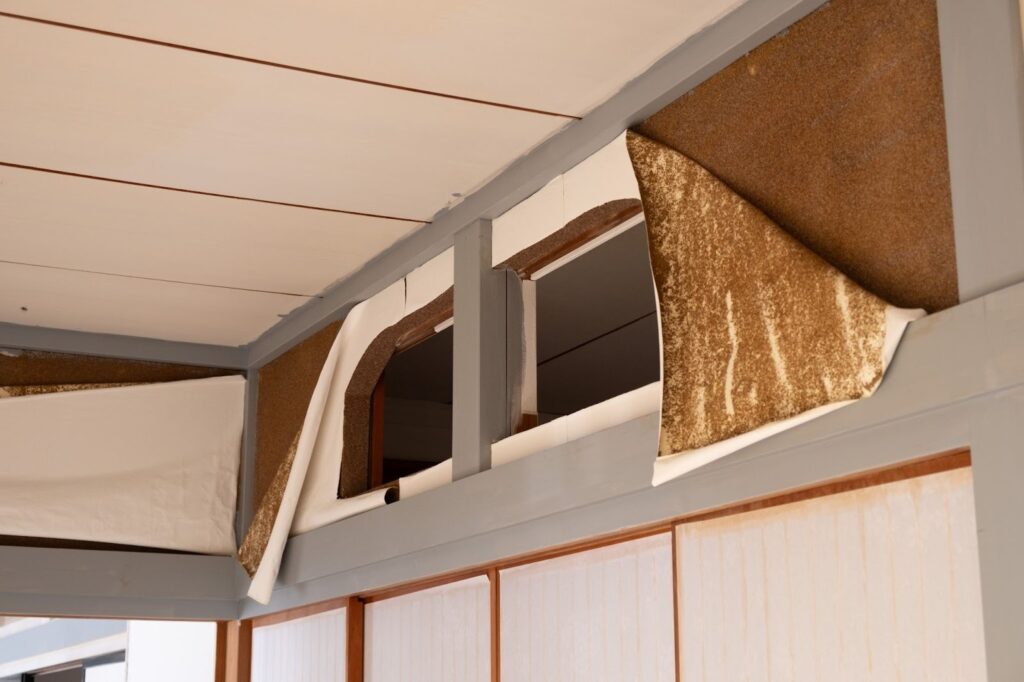 自宅の方ですが、天井がデコボコしていて壁紙が貼れませんでした。平面になるようにならしてから貼るべきだったのに、面倒くさくてやらなかったのがダメでしたね。同様に、砂壁に直接壁紙を貼ったのもベロンと剥がれてきちゃいました。